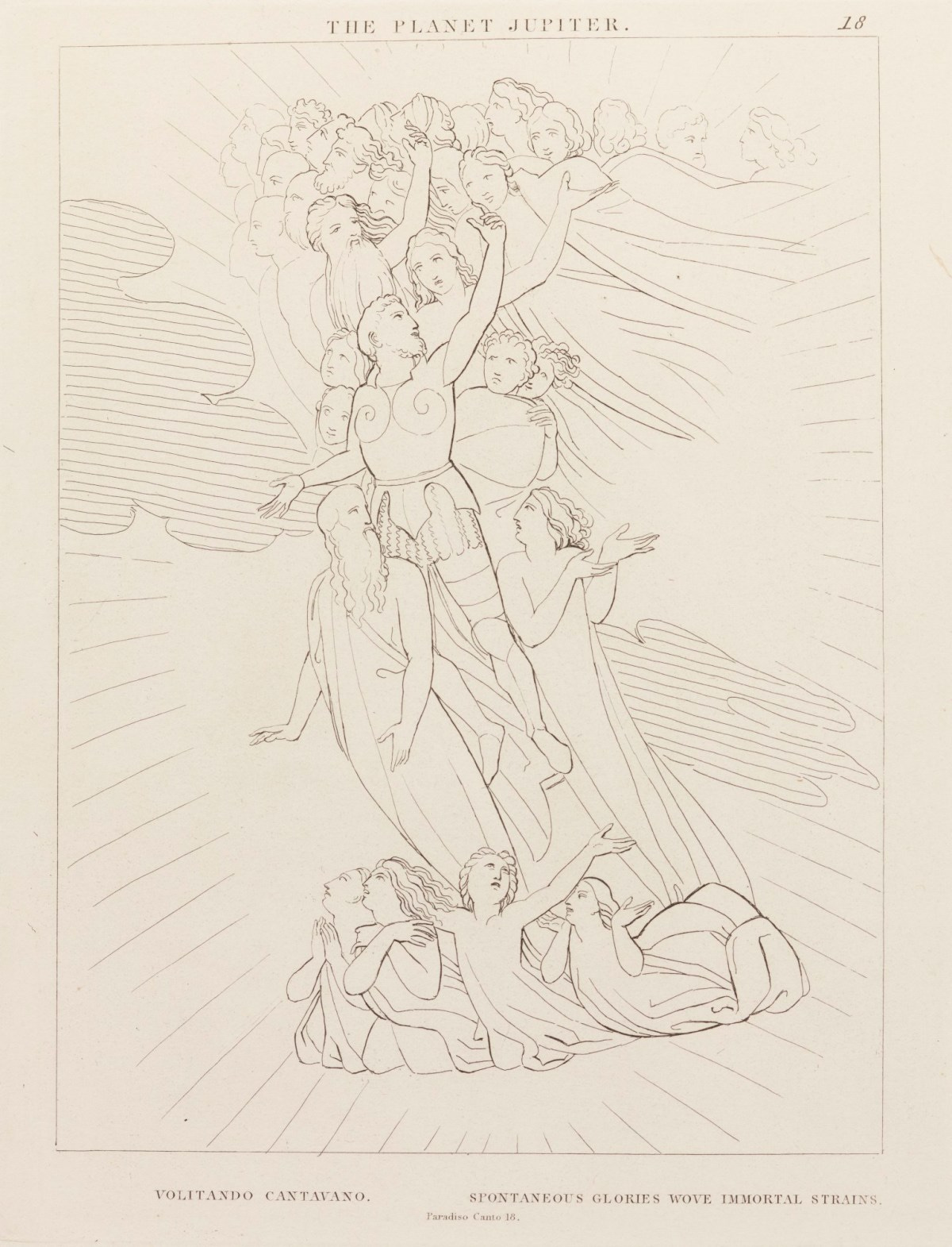 The fifth celestial realm of Mars, continued - Cacciaguida names nine heroes of the warriors of the faith - Dante and Beatrice ascend to the celestial realm of Jupiter - The lights of the souls there form words of Justice - The transformation of the letter M - The lily evolves into an Eagle - Dante condemns the injustice of avaricious popes.