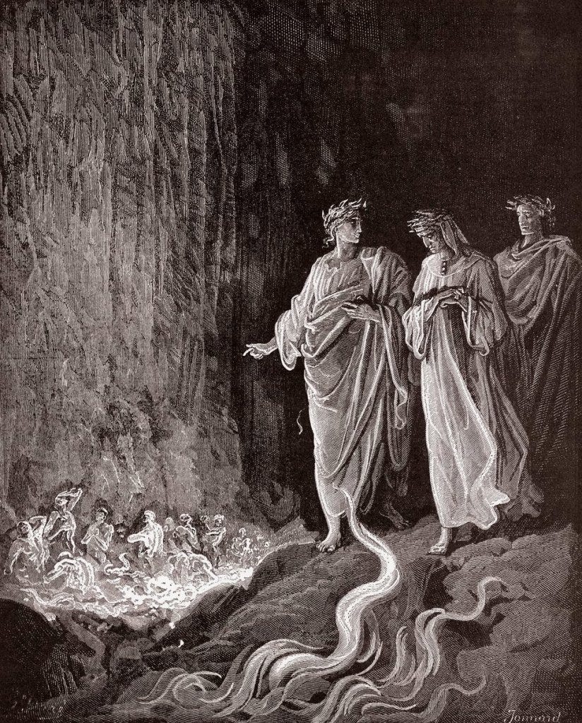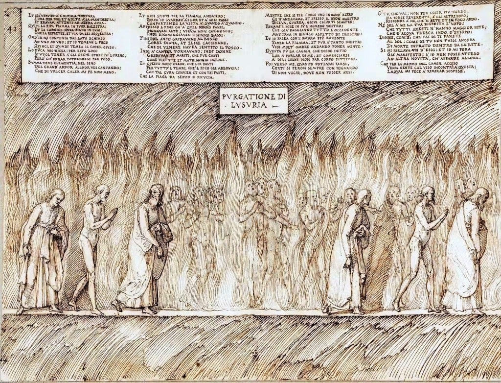 Having finished this lengthy and detailed explanation, Virgil, Statius, and Dante arrived on the seventh and last terrace, and were met with a wall of flame that reached out horizontally from the wall of the mountain on their left, and was blown up by a wind from the edge of the terrace on their right creating a space through which they could walk, but which was precarious and instilled fear into Dante all the same.