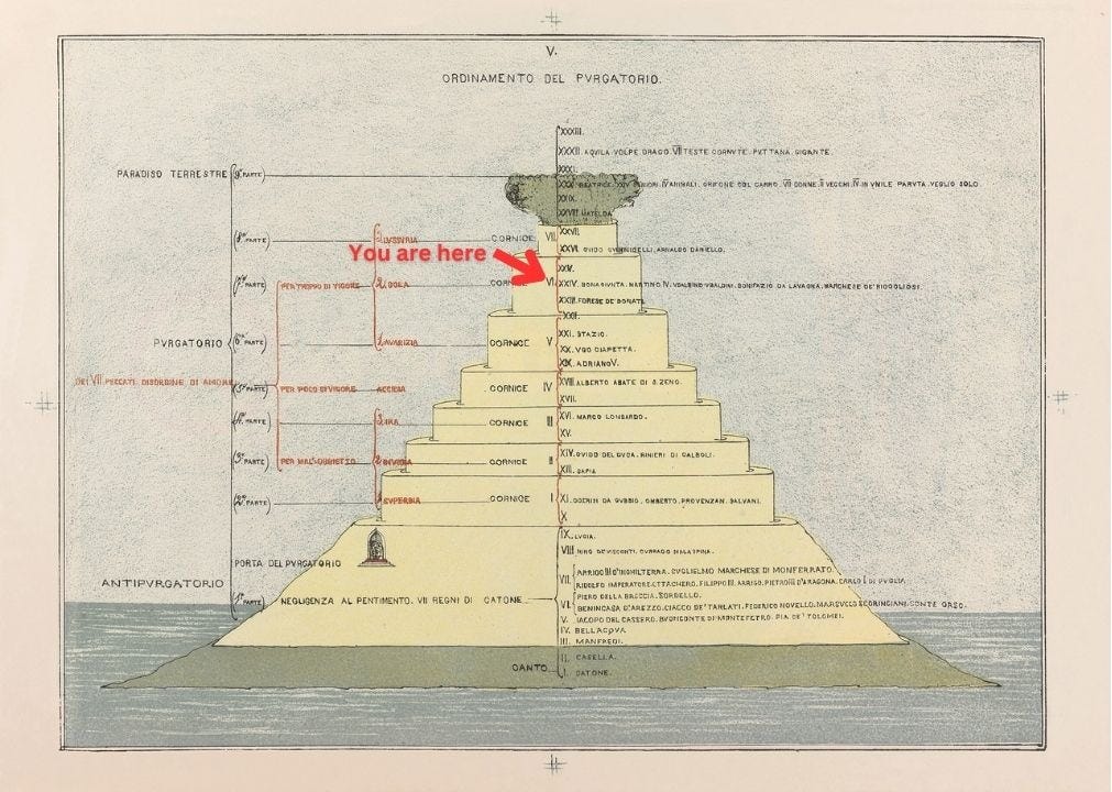 The gates of hell were wide while the passage through Purgatory gets narrower and narrower. My reader might remember that our path through Inferno became easier and easier (to a degree) the deeper we descended, and at some point Geryon and then the giants took us further down.
