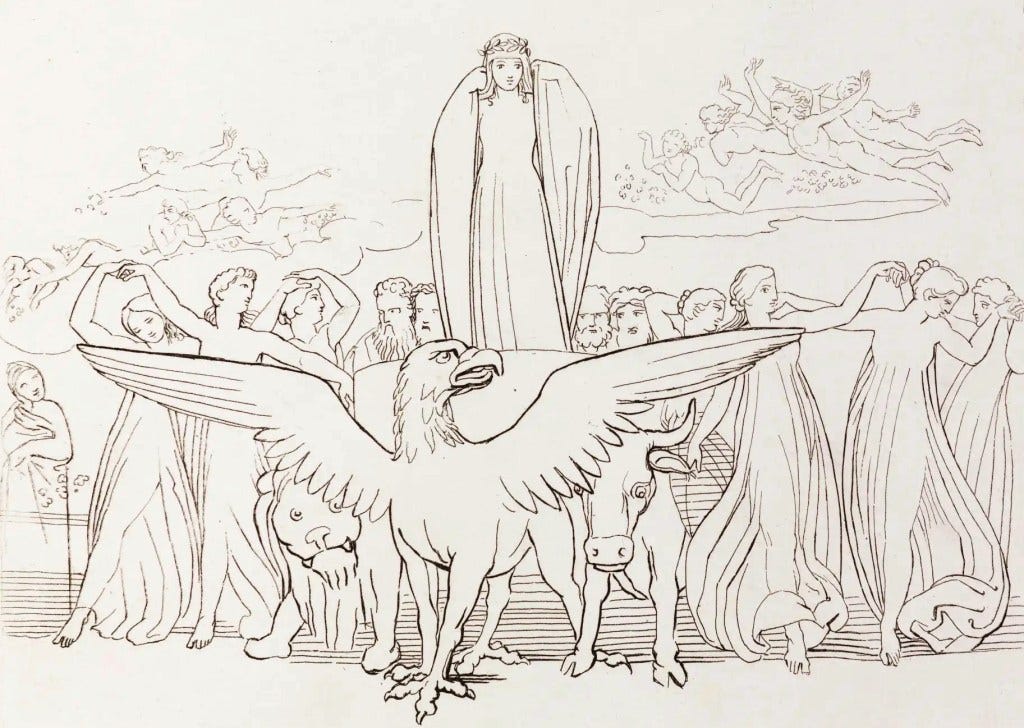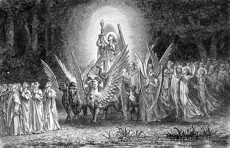 The triumphal chariot had halted before Dante, standing in the heavenly garden, across the river Lethe. The suspense of the pageant had built to an almost unbearable tension, as the sight of Beatrice was imminent.