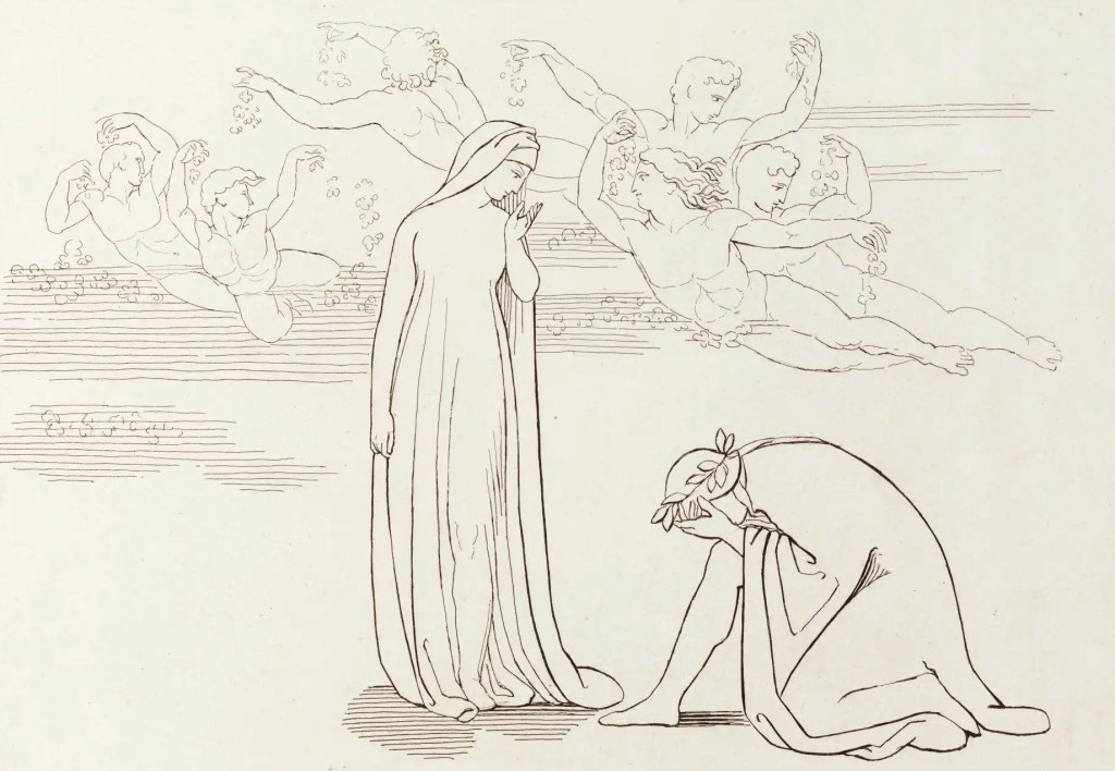 She inferred his journey was only taken due to her intervention; she almost scornfully asked if he had deigned to finally climb the mountain, that the place where she had led him is the place of human bliss, lest he think too much of himself and his work at arriving there. There is an intimacy to his shame, that bared soul with nowhere to hide from the faults of its past. Her pity toward him was stern and not yet tempered with mercy. She had given her welcome.