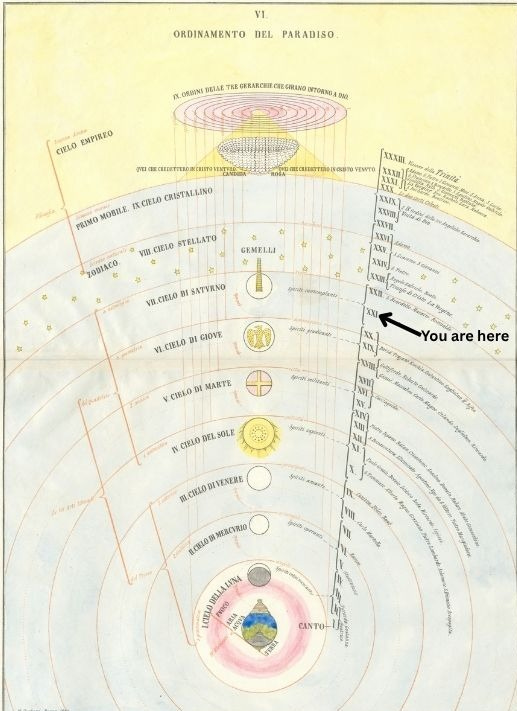 Welcome to Dante Book Club, where you and I descend into Hell and Purgatory to be able to ascend to Paradise. Our guide in Paradise is Beatrice, and in this twenty-first Canto, Dante and Beatrice rise to the contemplatives in the sphere of Saturn. You can find the main page of the read-along right here, reading schedule here, and the list of chat threads here.
