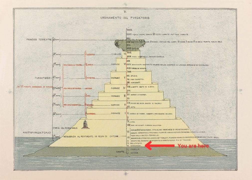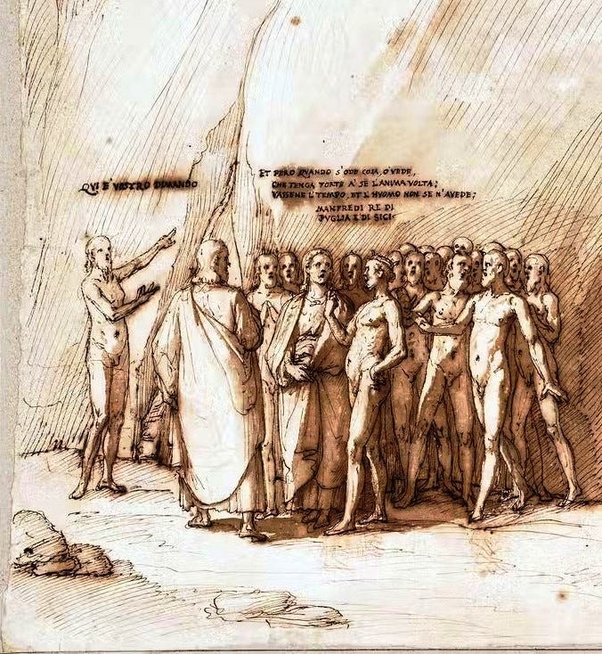 Welcome to Dante Book Club, where you and I descend into Hell and Purgatory to be able to ascend to Paradise. Our guide is the great Roman poet Virgil and in this Third Canto of the Purgatorio, we meet the Late Repentant and the Excommunicated. You can find the main page of the read-along right here, reading schedule here, the list of characters here (coming soon), and the list of chat threads here.