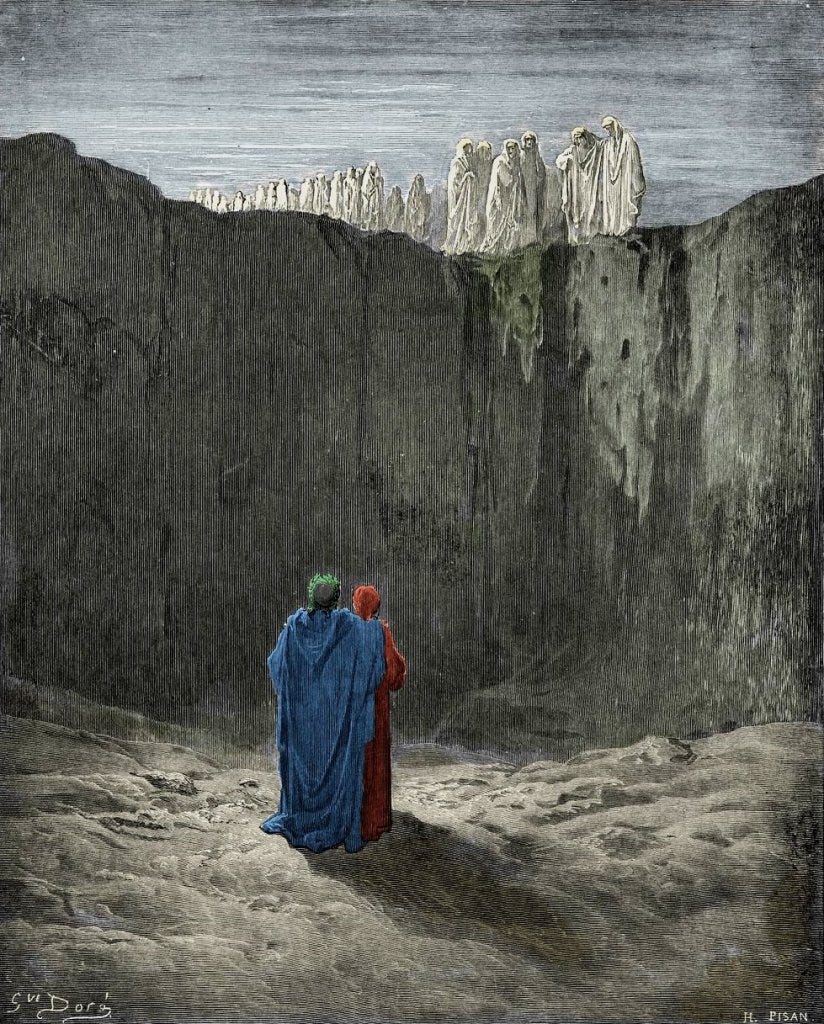 With this meditation, they return to the task before them; they find themselves at the foot of the impossibly tall Mount, as steep and foreboding as the coast between the village of Turbia and the fortified town of Lerici in northwestern Italy. Virgil wonders aloud where they should begin their ascent. Dante sees a group of souls in the distance walking ever so slowly, and Virgil, relieved at the hope of assistance, moves to ask them the way.