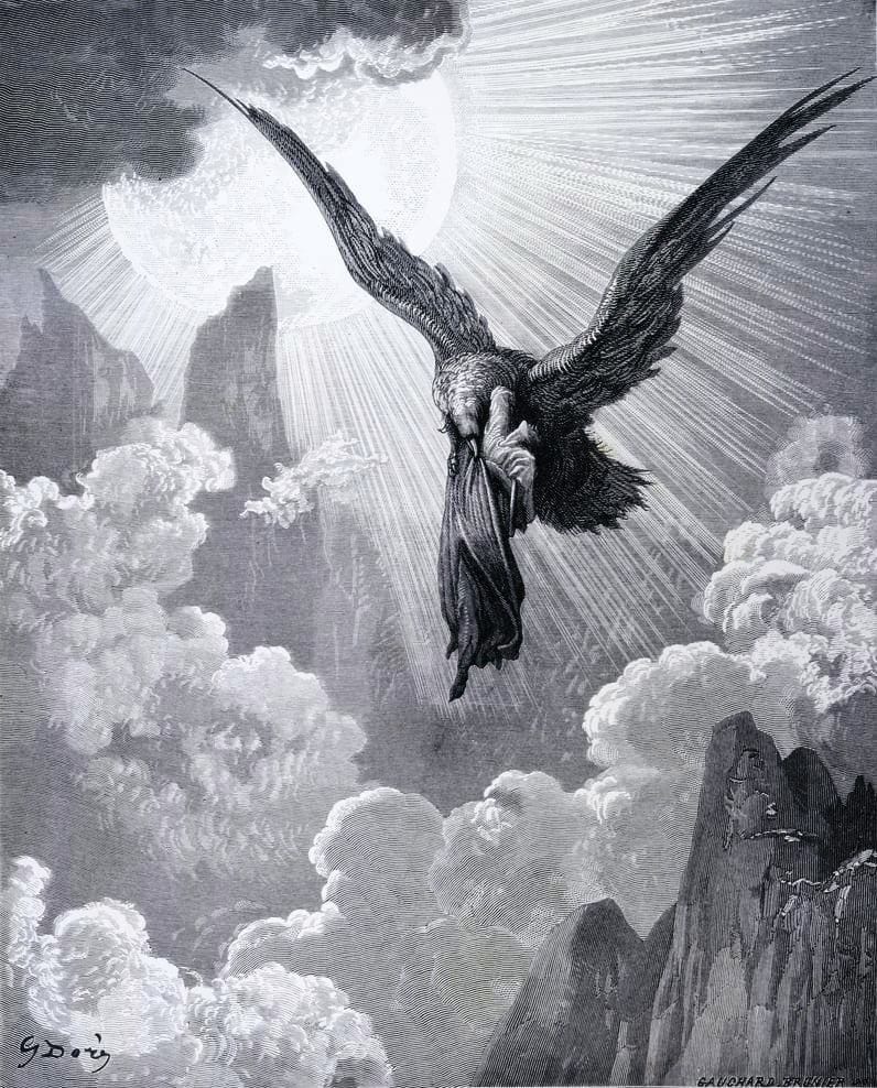 Dante alludes to the myth of Ganymede, a beautiful mortal boy, who was seized by Zeus (Jove) in the form of an eagle and taken to the heavens. There, the mighty god made him the immortal cupbearer of the gods. Dante, in contrast to the myth, becomes cupbearer of divine wisdom to us mortals and thus gains his own immortality.