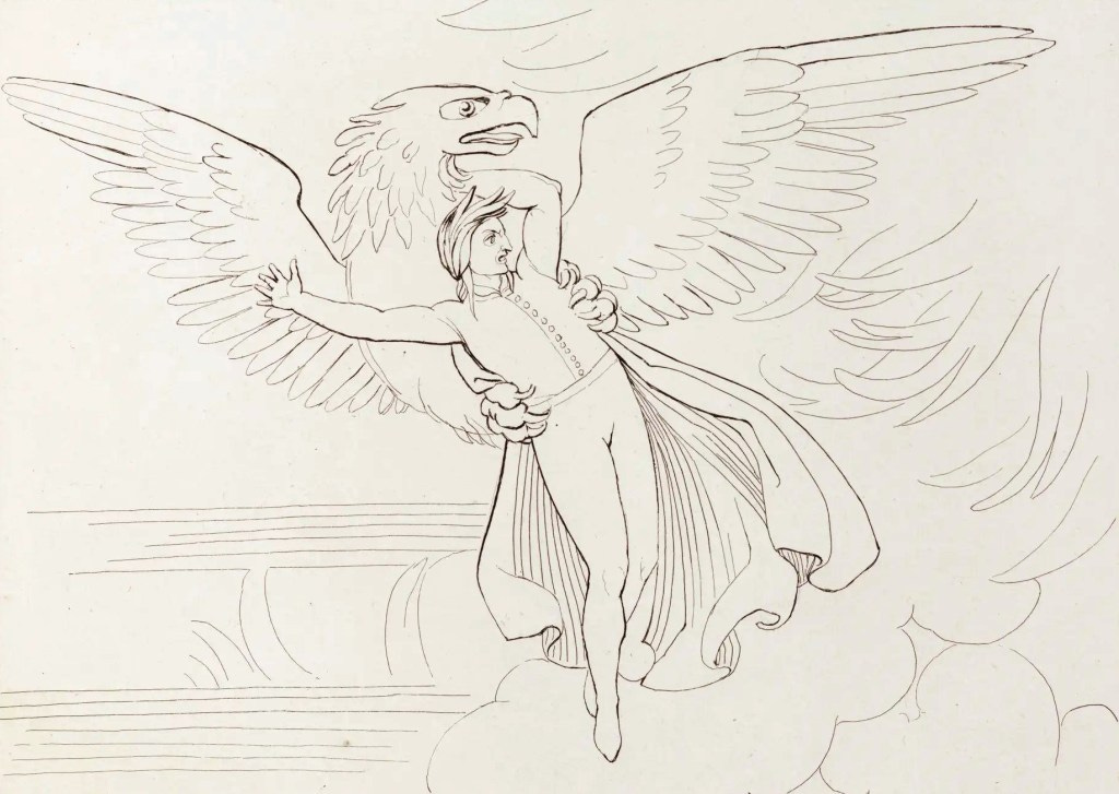 In his dream, he seemed to be lifted high into the air, even to the realm of the gods, as was Ganymede when he was abducted by Jupiter, who, enchanted by his great beauty-in some later accounts, not just enchantment, but an assault-stole him away to be the cupbearer to the gods. Statius told of Ganymede’s abduction thus:
