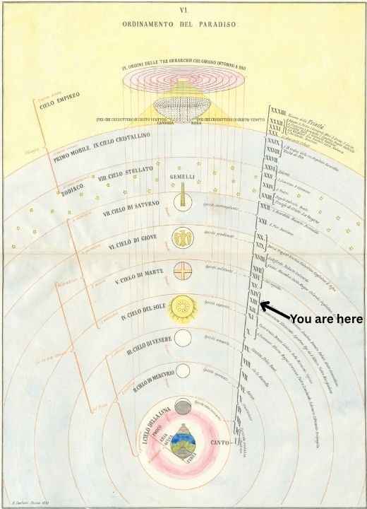 The great exiled Florentine is trying to render realities that dwarf our imagination. In Paradiso he makes the sciences sing and Canto XIII, in particular, concentrates our attention on primary and secondary creation, and on how divine light reflects through the nine orders of angels to the sublunar world.