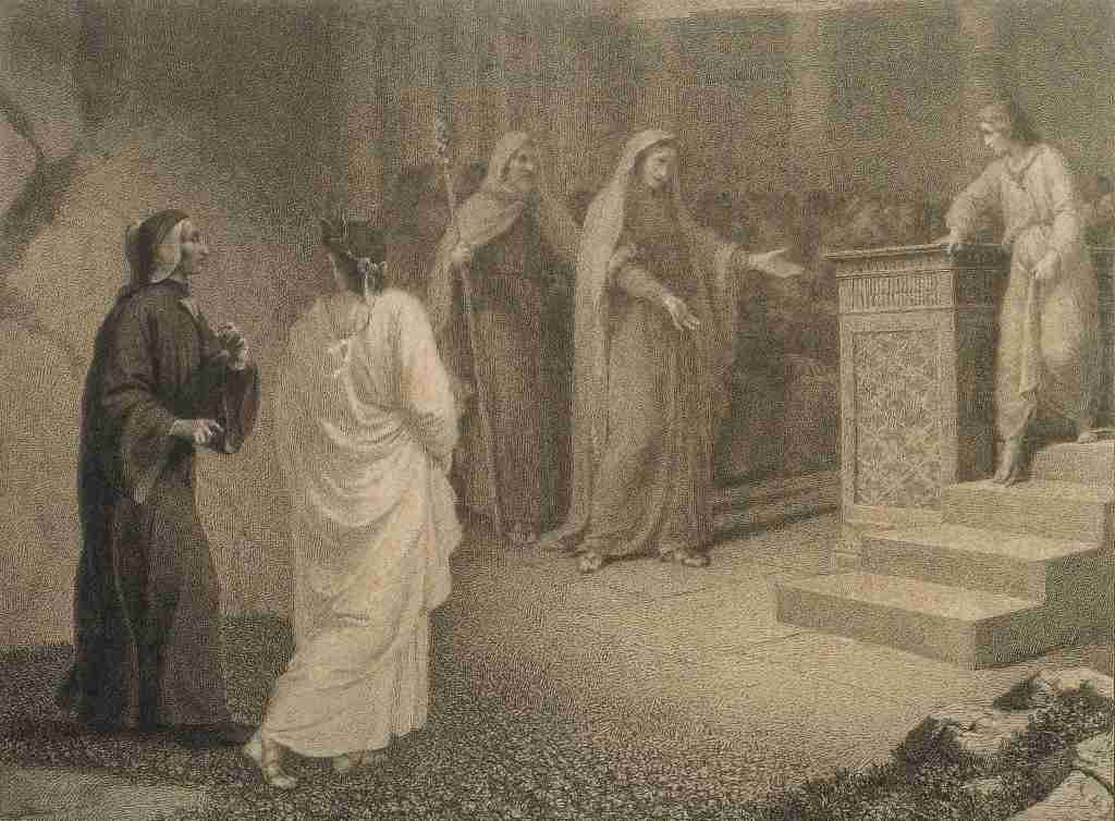 They had reached the third terrace; and just as we have seen in the terraces below, their first sight is a form of Mary, but in this instance it takes the form, for Dante, of an ecstatic vision. In this vision, Mary exemplifies the example of the virtue of this terrace. As we have entered into the realm of the Wrathful, this example of Mary embodies its opposite, or its whip; that of Meekness and Gentleness.