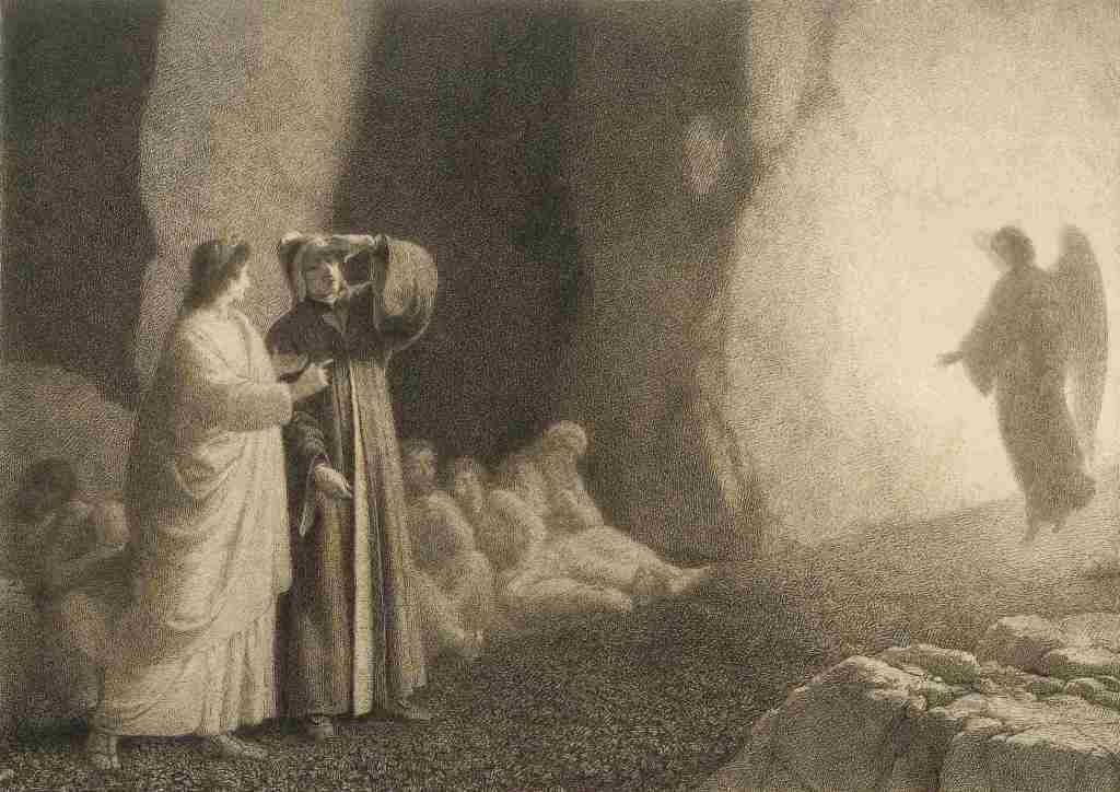Virgil reassured him that this light was in fact an invitation from the Angel of the second terrace, the Angel of Mercy and Generosity, the opposite of Envy. They have been invited to ascend to the third terrace; as they continue their journey, Virgil told him, the dazzling light would cease to blind him, but would instead increasingly fill him with the joy his soul was made to experience. Just as Dante gained progress with his lightened burden as he climbed, making the journey easier, here he was assured that he will also be able to bear looking at more and more light. The angel pointed them to the place of ascent;