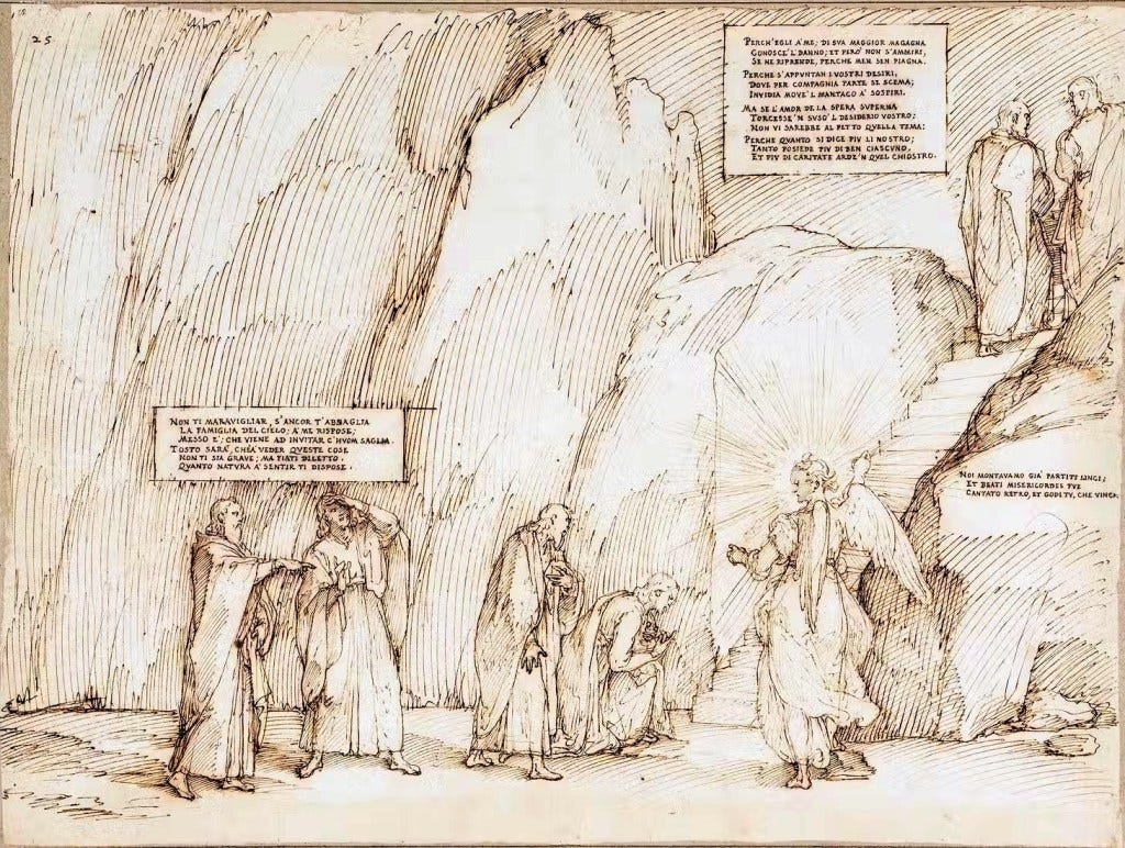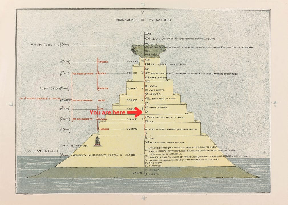 Welcome to Dante Book Club, where you and I descend into Hell and Purgatory to be able to ascend to Paradise. Our guide is the great Roman poet Virgil and in this Fifteenth Canto of the Purgatorio, Dante has an ecstatic vision of Meekness. You can find the main page of the read-along right here, reading schedule here, and the list of chat threads here.