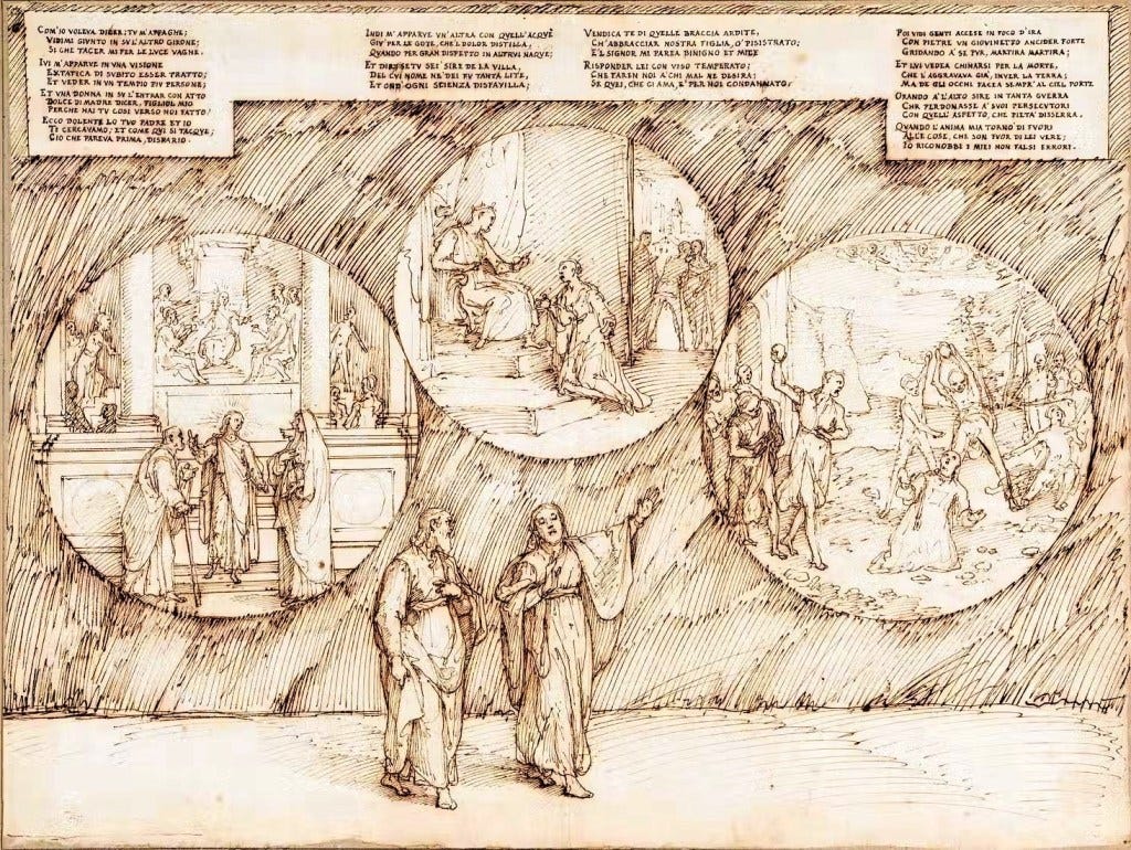 We now enter the realm of mystery, of profound spiritual experience. This is no longer the domain of constructed insight, shaped by Reason as Virgil represents but of something deeper: visions received, not built. A moment of visione estatica - ecstatic vision - where understanding arrives not through logic, but through grace.